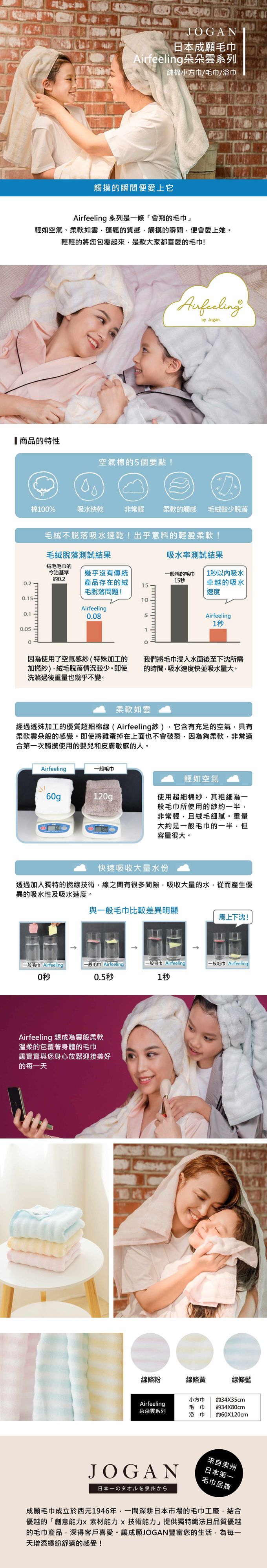 Airfeeling朵朵雲系列為一款具有空氣感的毛巾,使用經過特殊加工的高級超細棉線。它充滿著空氣感,並具有柔和、雲朵般的觸感,它的重量僅為普通毛巾的一半但卻有十足的蓬鬆感。輕柔的色系,多款尺寸可選擇,是款家家戶戶都適合使用的毛巾系列!