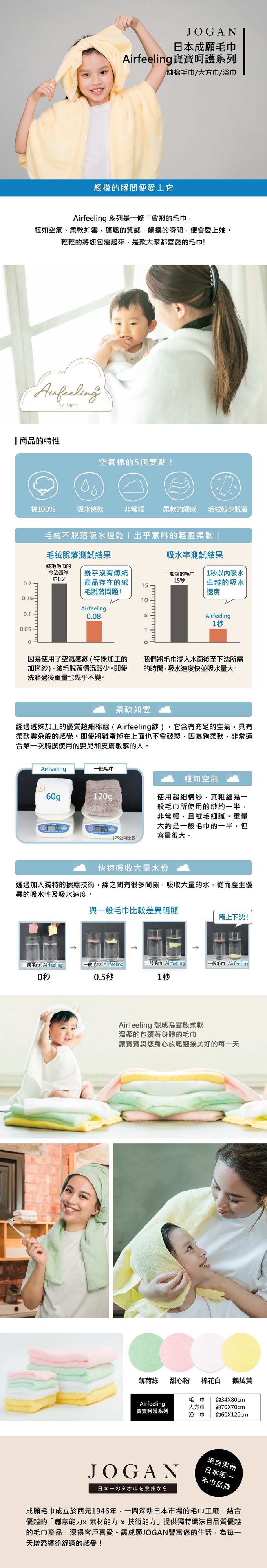 Airfeeling寶寶呵護系列為一款具有空氣感的毛巾,使用經過特殊加工的高級超細棉線,它充滿著空氣感,並具有柔和、雲朵般的觸感,非常適合剛開始使用毛巾產品的嬰兒及肌膚敏感的人。