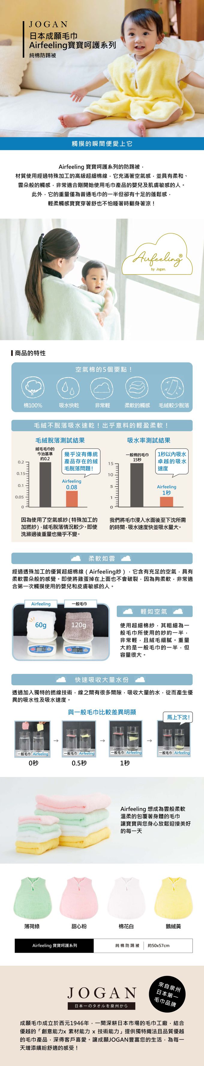 Airfeeling寶寶呵護系列的防踢被,材質使用經過特殊加工的高級超細棉線,它充滿著空氣感,並具有柔和、雲朵般的觸感,非常適合剛開始使用毛巾產品的嬰兒及肌膚敏感的人。
