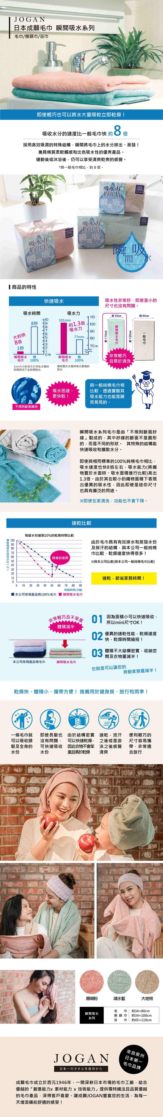 瞬間吸水系列毛巾採用高效吸濕的特殊結構,瞬間將毛巾上的水分排出、蒸發!吸收水分的速度比一般毛巾快約 8 倍,兼具棉質柔軟觸感和出色吸水性的優秀產品。動後或沐浴後,仍可以享受清爽乾爽的感覺。