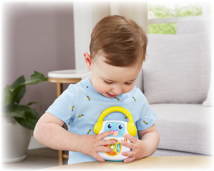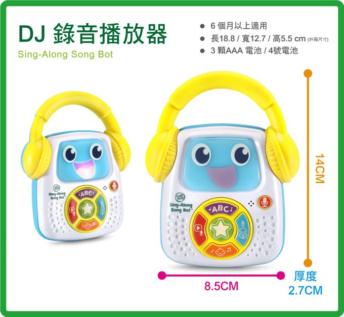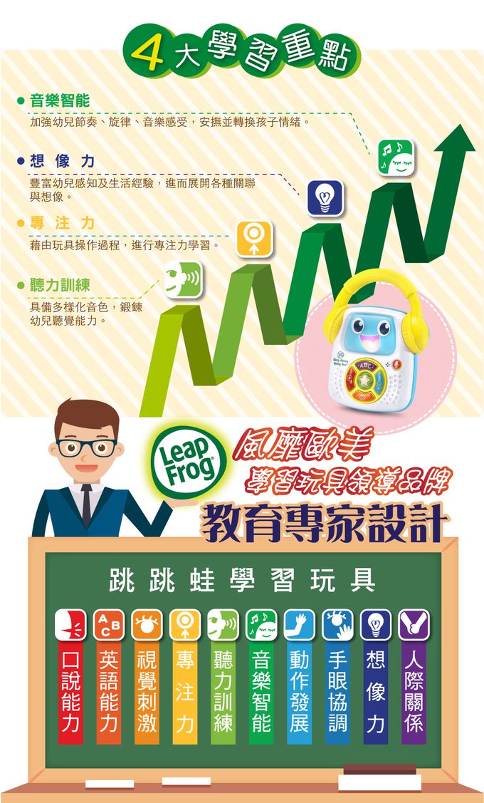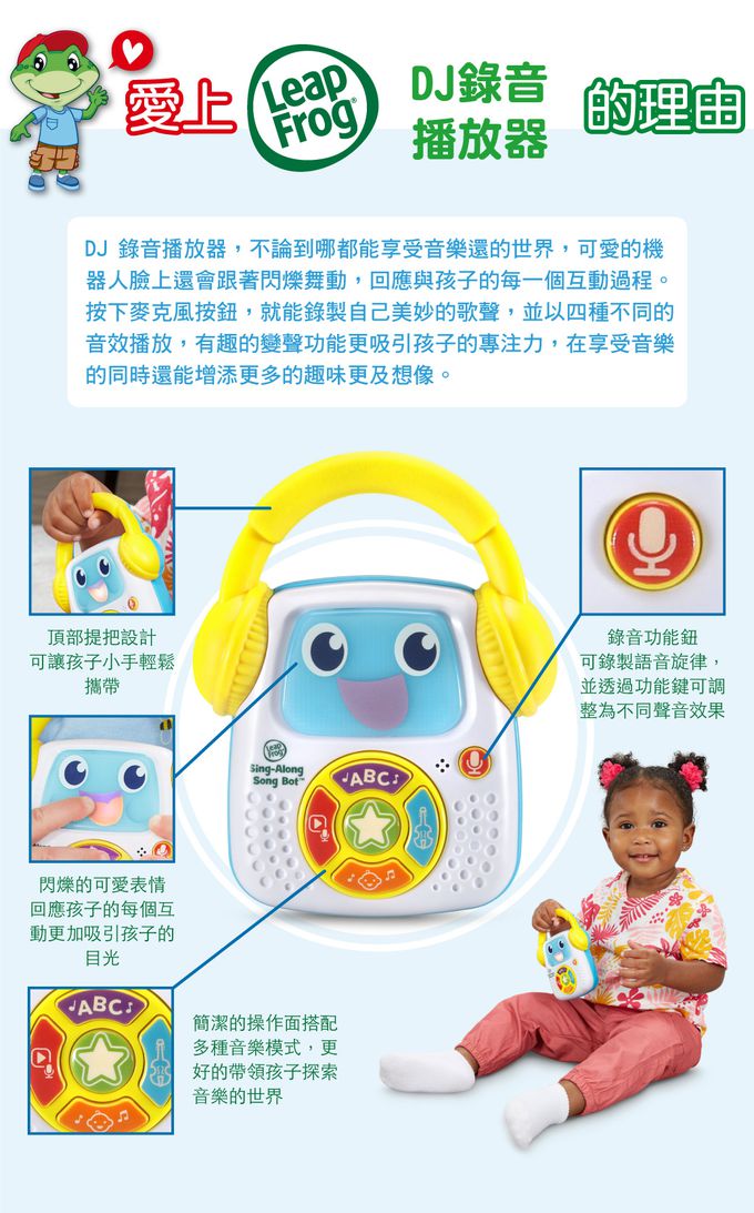 機器人臉上也會跟著閃爍舞動。四種音樂按鍵,ABC、星星、吉他、寶寶音樂,