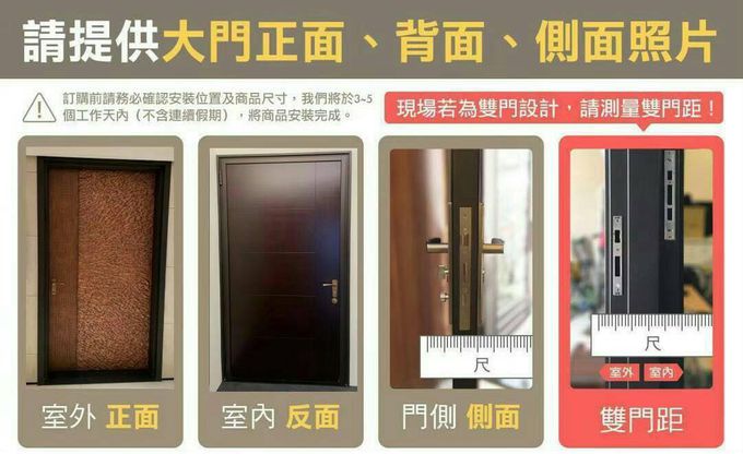 購買或是諮詢前請務必確認安裝位置及商品尺寸,您可以用手機將安裝大門的 正面、側面、背面 拍照後傳給「服務人員」,我們會盡快為您進行安裝派工。