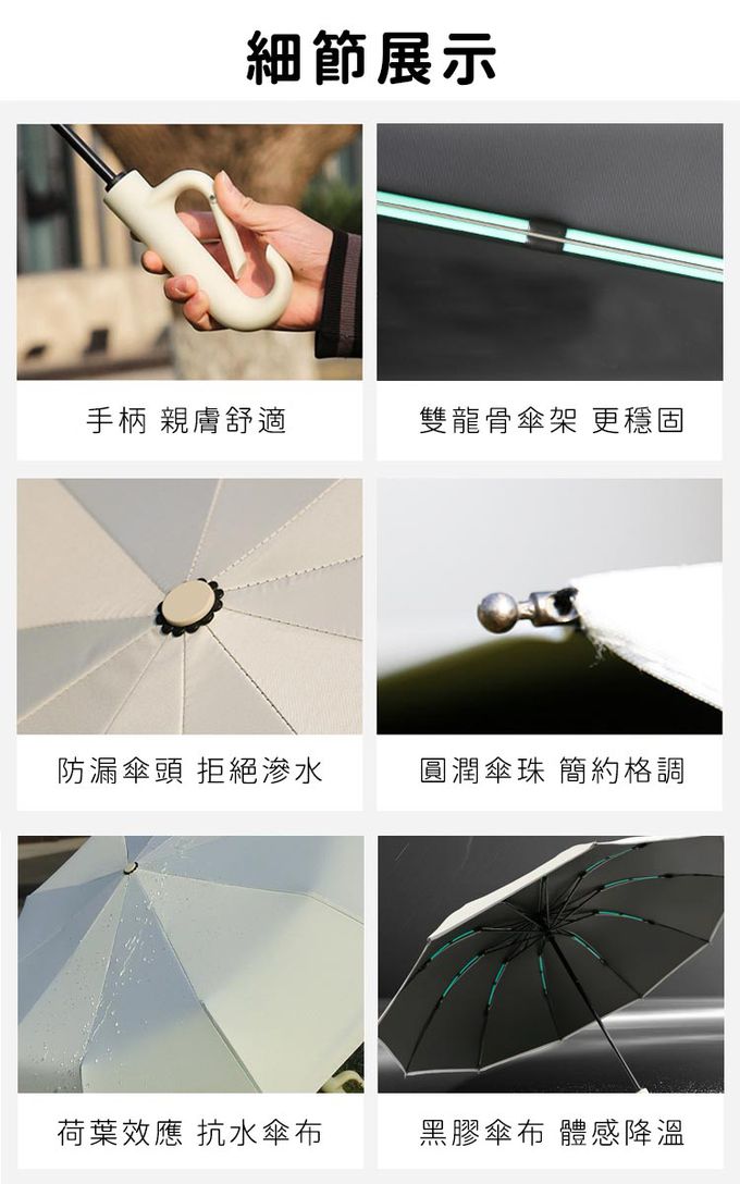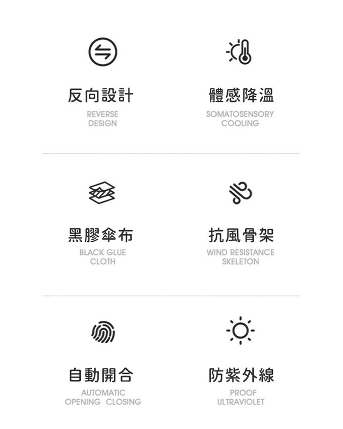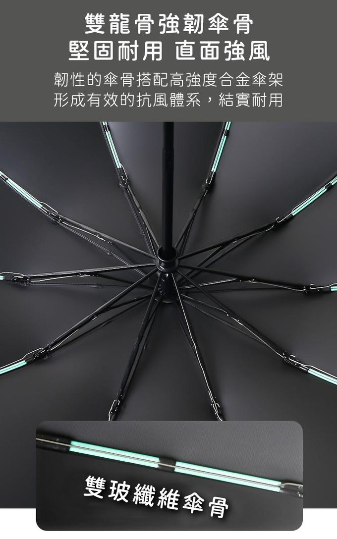材質:傘布/210T高密度碰擊布、傘內材質/黑膠塗層、傘骨/纖維雙龍骨、中棒/合金、傘柄/ABS+橡膠塗層漆