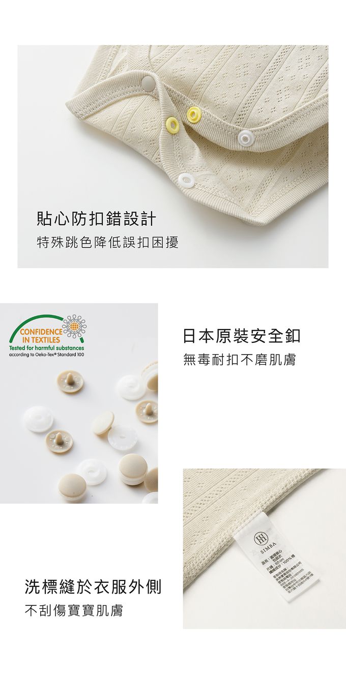 使用方式:將寶寶頭頸部套入包屁衣圓領活動肩處,並扣上下方釦子即完成。