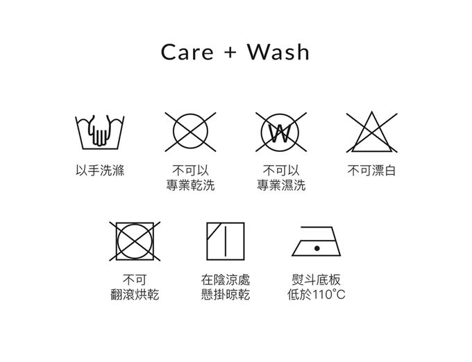 洗滌/清潔建議:•以手洗滌,水溫最高不應超過攝氏四十度•不可專業乾洗•不可專業濕洗•不可漂白•不可翻滾烘乾•在陰涼處懸掛晾乾•熨斗底板最高溫度攝氏一百一十度之熨燙及壓燙,且不應使用蒸氣。(蒸氣燙可能導致不可回復的損傷)