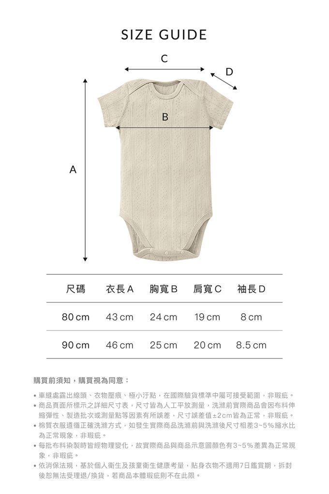 詳細尺寸:•80cm:衣長約43±2cm/胸寬約24±2cm/肩寬約19±2cm/袖長約8±2cm •90cm:衣長約46±2cm/胸寬約25±2cm/肩寬約20±2cm/袖長約8.5±2cm
