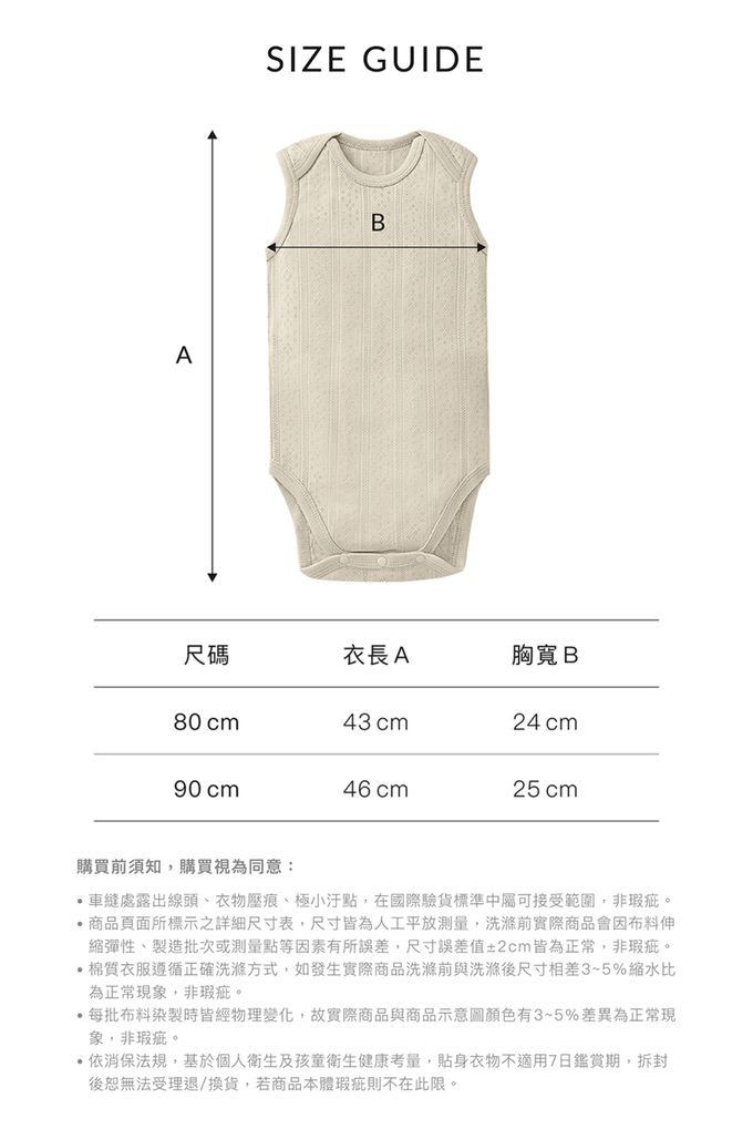 詳細尺寸:•80cm:衣長約43±2cm/胸寬約24±2cm •90cm:衣長約46±2cm/胸寬約25±2cm