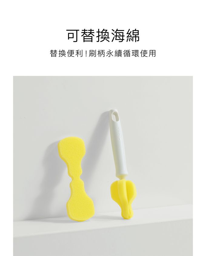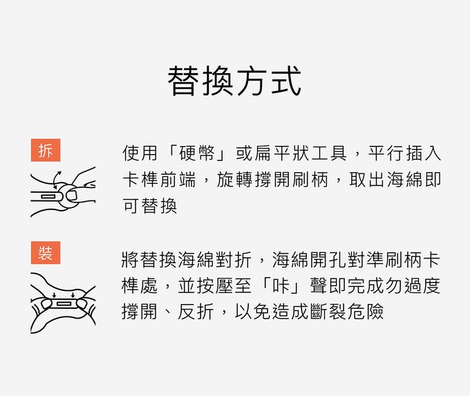 使用方式:•拆卸:使用「硬幣」或扁平狀工具,平行插入卡榫前端,旋轉撐開刷柄,取出海綿即可替換。 •安裝:將替換海綿對折,海綿開孔對準刷柄卡榫處,並按壓至「咔」聲即完成。勿過度撐開、反折,以免造成斷裂危險。