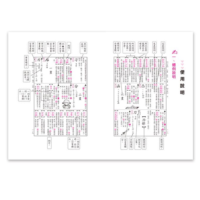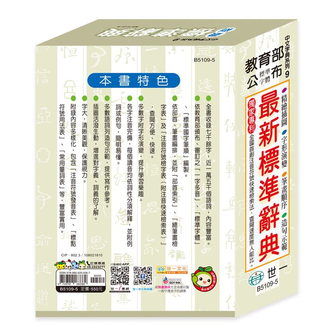 本辭典收錄約七千字,依教育部頒布.審訂的標準字體.標準國字筆順與一字多音 審訂表編輯;各字注音完備,附完整筆順,多數字標示字形演變,多數語詞附例句; 字體大,閱讀舒適,並有生動的插圖;附三種檢索方式及實用的附錄,內容新且豐富實用,是讀者不可或缺的工具書.*三種檢索方式(注音符號.總筆畫.部首索引),讓您查閱更方便.*各字注音完備,詞條廣博並多附例句.*新增獨家專利"注音符號快速檢索法",讓您成為檢字高手.