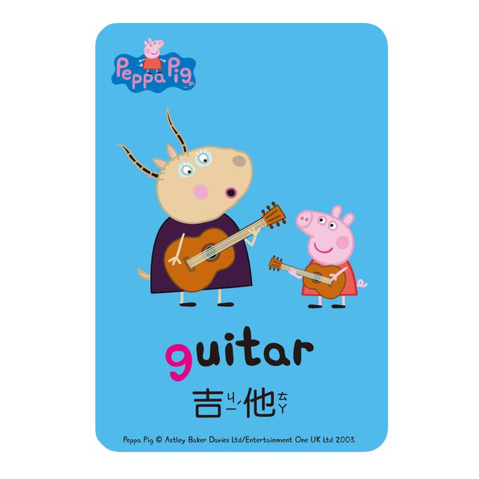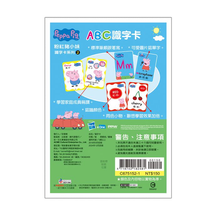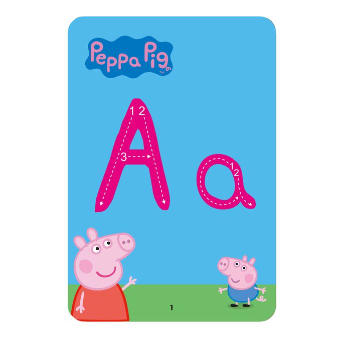 粉紅豬小妹佩佩是一隻很可愛但是有點愛指揮別人的4歲小豬,他和爸爸豬、媽 媽豬還有弟弟喬治每天都開心的生活在一起。熱愛冒險的粉紅豬小妹這次帶領小朋友進入有趣的ABC世界!36張識字卡,A-Z字母卡(26張+1張大小寫字母表)、角色卡(4張)及顏色卡(5張)。字母卡正面是清晰、大字體的英文字母大小寫及筆順,背面有英文單字和活潑可愛的插圖!角色卡認識粉紅豬一家人也學習中英文家人稱謂。顏色卡以動植物顏色特性認識紅、黃、藍、綠及粉紅色中英文,語文學習、圖像認知、家人稱謂、色彩學習全都有,讓孩子在粉紅豬小妹俏皮的陪伴下增進各方面的能力,享受遊戲和學習的樂趣!