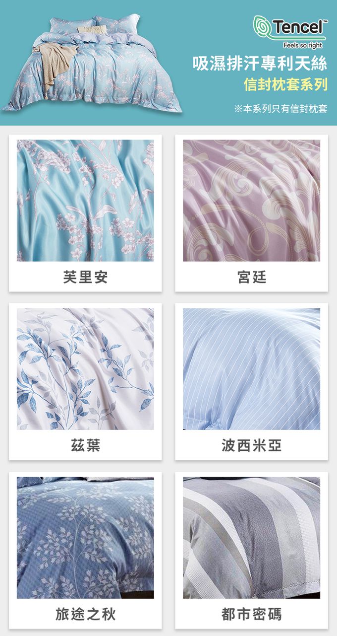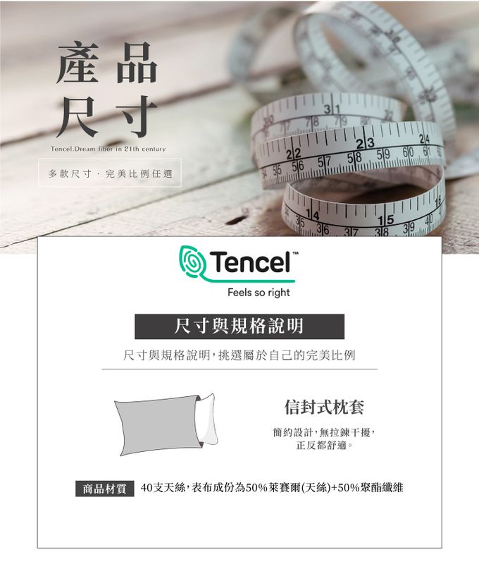 注意事項:商品內容 : 天絲信封式枕套2入 商品內容 : .美式信封枕套x2―45x75公分±5% 產品材質: .材質―50%萊賽爾纖維 (天絲TENCEL)+50%聚酯纖維 .顏色-如產品圖示,網頁圖片因拍攝關係,與實品略有差異,實際顏色以出貨為主
