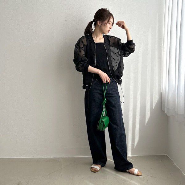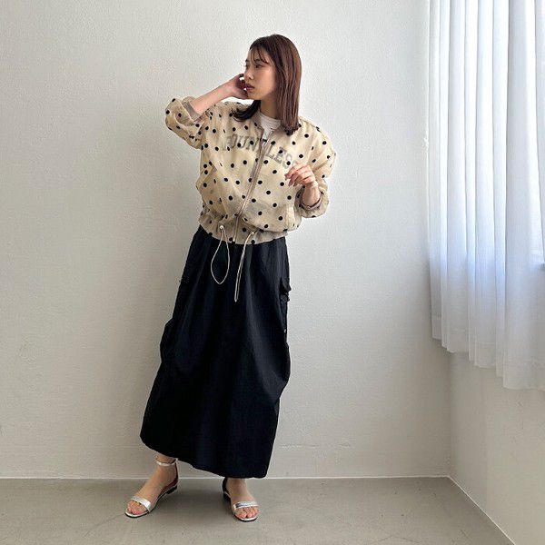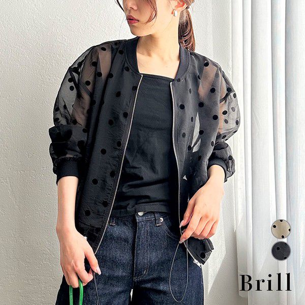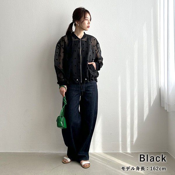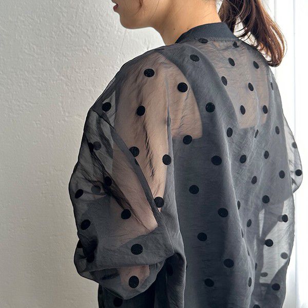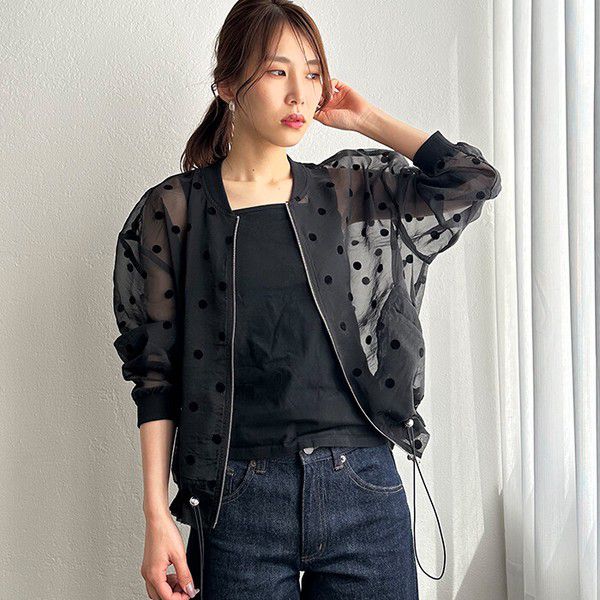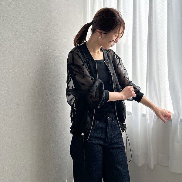 日本 ihuu - 圓點透膚下擺抽繩拉鍊薄外套-黑