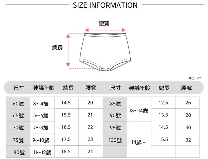60[適穿年齡:3-4Y]、65[適穿年齡:5-6Y]、70[適穿年齡:7-8Y]、75[適穿年齡:9-10Y]、80[適穿年齡:11-12Y]、85[適穿年齡:13-14Y]、90[適穿年齡:13-14Y]、95[適穿年齡:14Y以上]、100[適穿年齡:14Y以上]