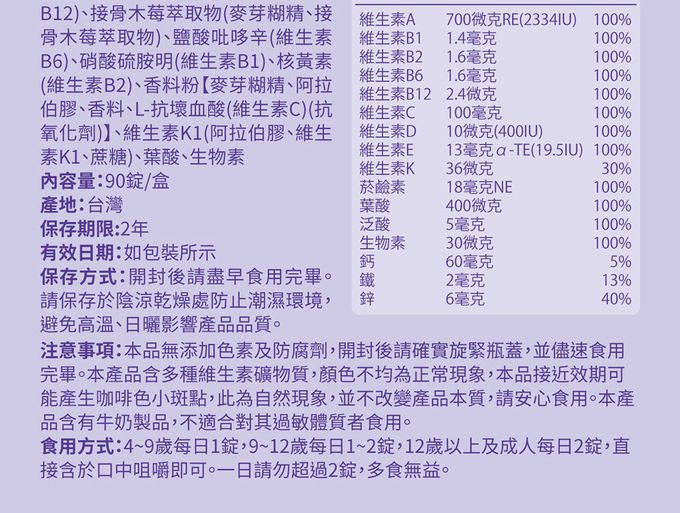 注意事項:適用年齡 : 4歲以上 本品無添加色素及防腐劑,開封後每次開關請確實緊閉瓶蓋,並請盡速使用完畢。 本產品含多種維生素礦物質,顏色不均為正常現象,請安心食用。 本產品含有牛奶製品,不適合對其過敏體質者食用。*接近效期可能產生小斑點為自然現象