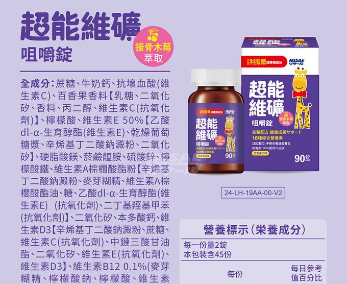 成分:蔗糖、牛奶鈣、抗壞血酸(維生素C)、百香果香料【乳糖、二氧化矽、香料、丙二醇、維生素C(抗氧化劑)】、檸檬酸、維生素E 50%【乙酸dl-α-生育醇酯(維生素E)、乾燥葡萄糖漿、辛烯基丁二酸鈉澱粉、二氧化矽】、硬脂酸鎂、菸鹼醯胺、硫酸鋅、檸檬酸鐵、維生素A棕櫚酸酯粉【辛烯基丁二酸鈉澱粉、麥芽糊精、維生素A棕櫚酸酯油、糖、乙酸dl-α-生育醇酯(維生素E) (抗氧化劑)、二丁基羥基甲苯(抗氧化劑)】、二氧化矽、本多酸鈣、維生素D3【辛烯基丁二酸鈉澱粉、蔗糖、維生素C(抗氧化劑)、中鏈三酸甘油酯、二氧化矽、維生素E(抗氧化劑)、維生素D3】、維生素B12 0.1%(麥芽糊精、檸檬酸鈉、檸檬酸、維生素B12)、接骨木莓萃取物(麥芽糊精、接骨木莓萃取物)、鹽酸☆哆辛(維生素B6)、硝酸硫胺明(維生素B1)、核黃素(維生素B2)、香料粉【麥芽糊精、阿拉伯膠、香料、L-抗壞血酸(維生素C)(抗氧化劑)】、維生素K1(阿拉伯膠、維生素K1、蔗糖)、葉酸、生物素