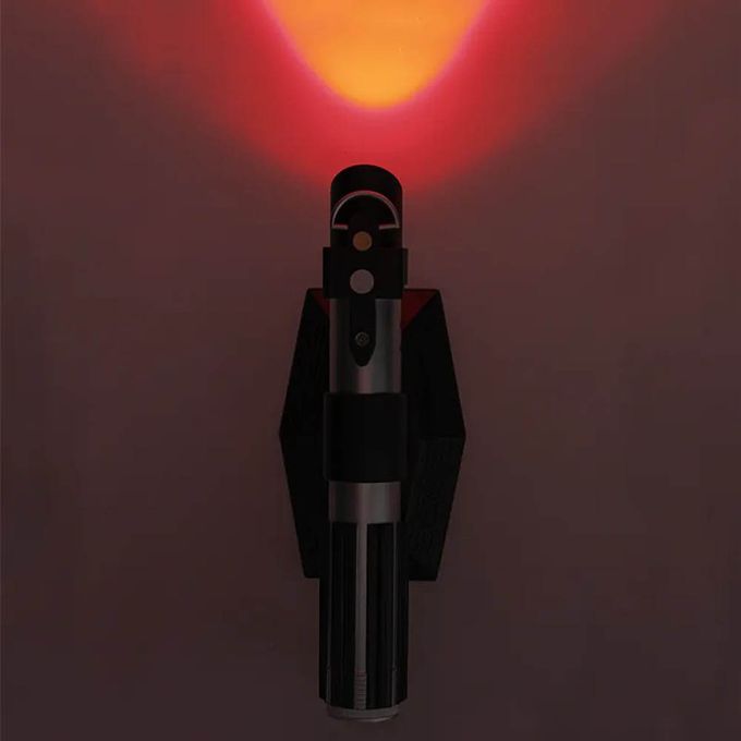 - 按壓開關會播放電影光劍啟動音效,亮燈後釋放出紅色投射光源