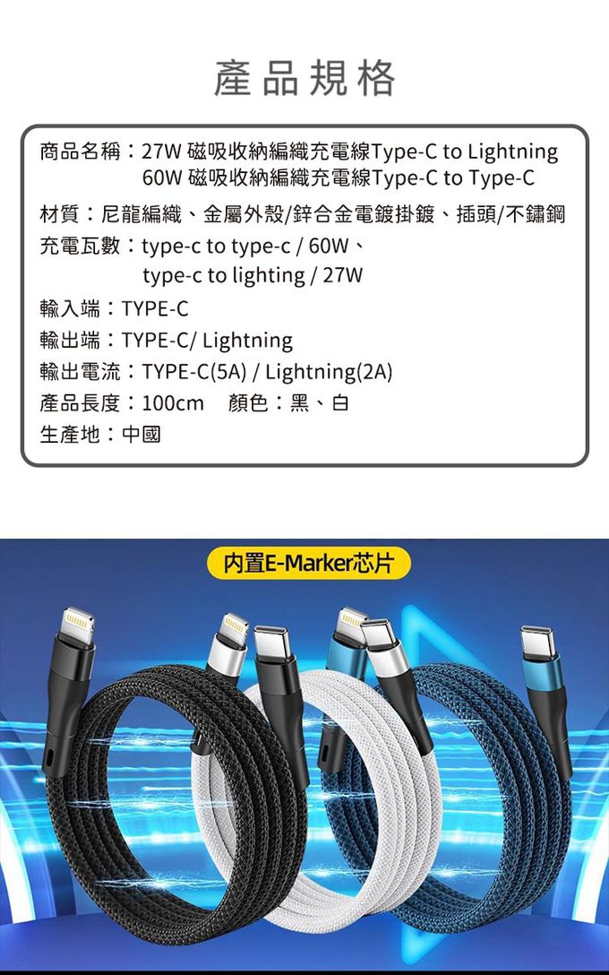品名:磁吸收納編織充電線Type-C to Type-C(100cm)