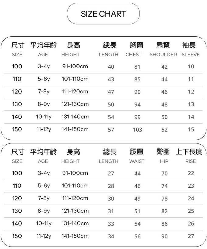 尺寸從90-150公分都有,大小孩和小寶貝都可以穿!