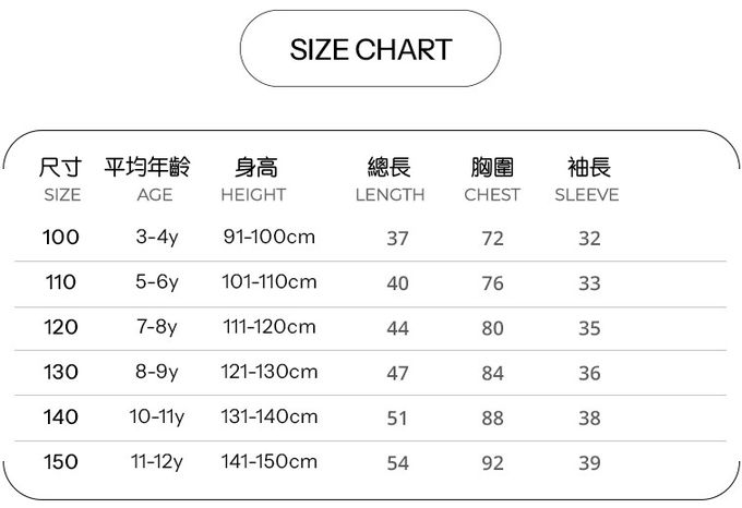 尺寸從90-150公分都有,大小孩和小寶貝都可以穿!
