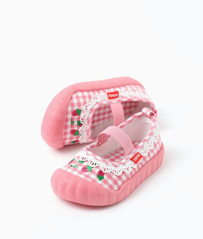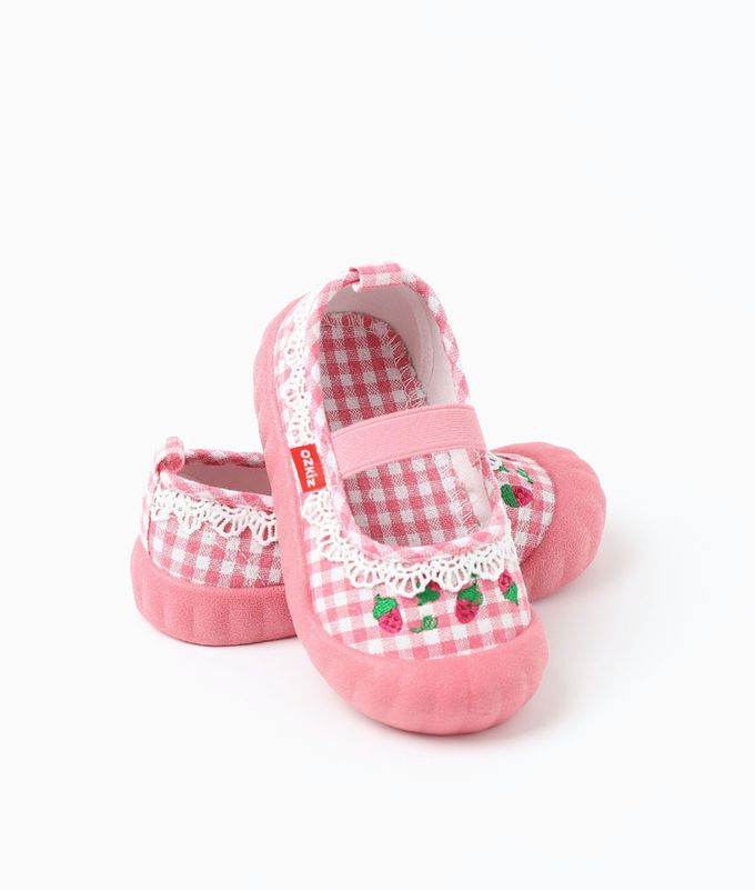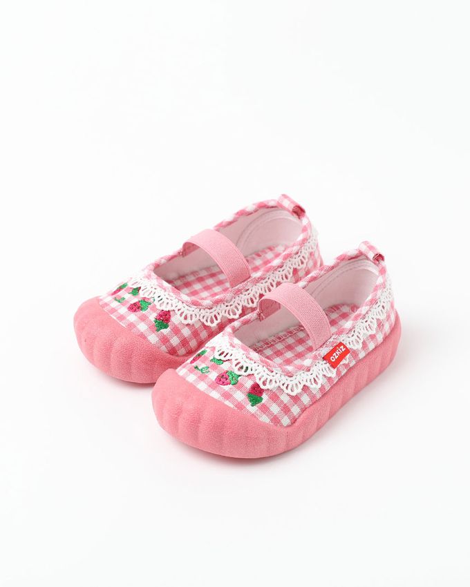 韓國 OZKIZ - 草莓刺繡格紋幼稚園室內鞋-粉紅