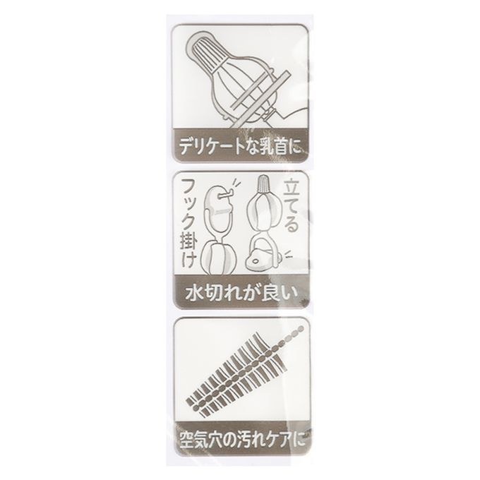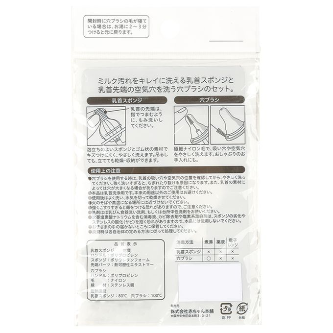 注意事項:●耐熱溫度:奶嘴刷80℃,小孔刷具100℃。●請注意,使用小孔刷具時,請確認奶嘴的吸孔和氣孔位置,然後輕輕清洗。過度用力清洗可能導致撕裂,且根據奶嘴材質的不同,有些小孔可能變大。●請勿作為其他用途使用。●使用後請用清水洗淨並將水分瀝乾後晾乾。●請勿放置在火源旁或會產生高溫的地方。●請注意,強力擦拭可能導致刮傷。●請使用奶瓶專用洗潔劑或中性洗潔劑。●請勿使用含次氯酸鈉的消毒液、除霉劑或含氯漂白劑,以免導致劣化。●丟棄時請遵循各地方環保局的規定處理。●奶嘴海綿刷:不可使用微波爐・消毒液・煮沸消毒。●小孔刷具:可煮沸消毒。不可用藥液消毒。不可放入微波爐。