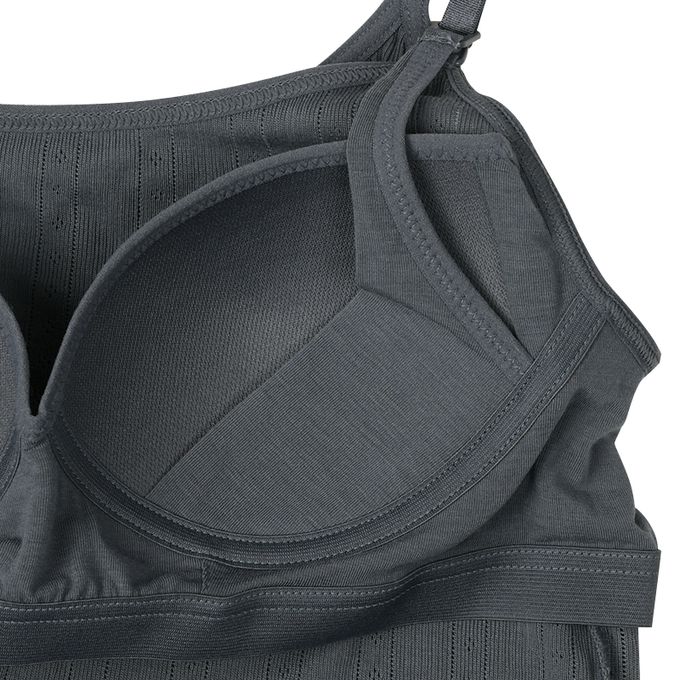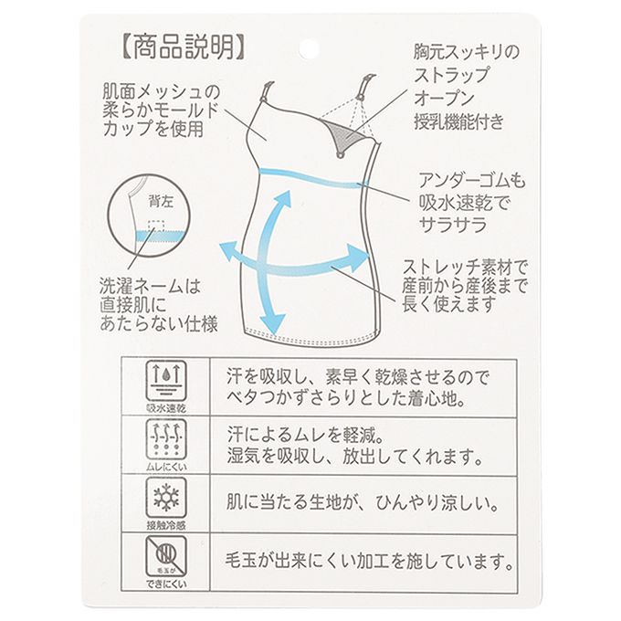 為了支撐胸圍,下圍使用鬆緊帶,產前到產後可長久使用。下圍的鬆緊帶使用吸水速乾的材質。