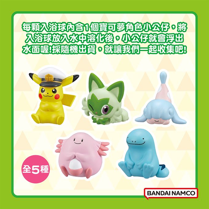 每顆入浴球內含1個寶可夢角色小公仔,將入浴球放入水中溶化後,小公仔就會浮出水面喔!共有船長皮卡丘、新葉喵、迷布莉姆、吉利蛋、沼王五款寶可夢,採隨機出貨,就讓我們一起收集吧!