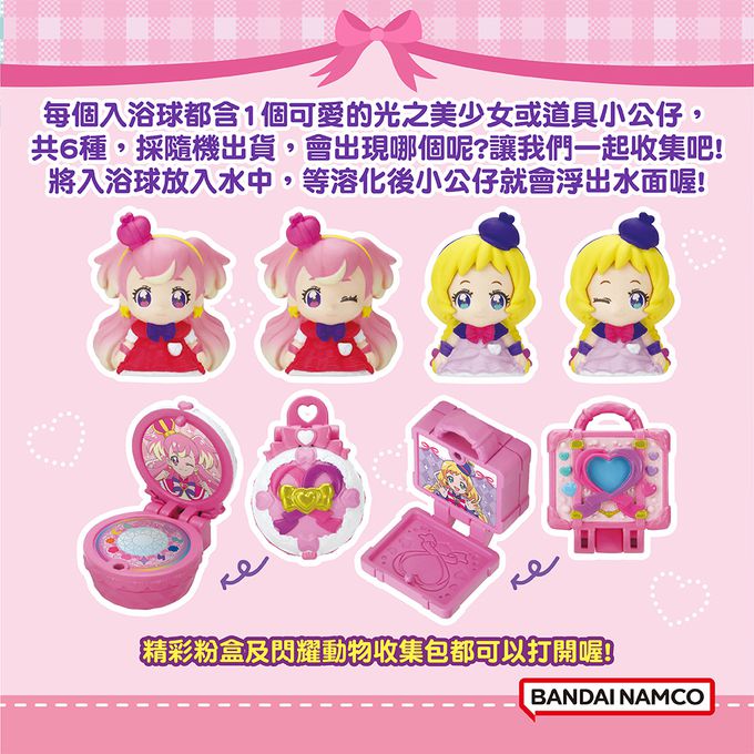 每個入浴球都含1個可愛的光之美少女或道具小公仔,共6種,採隨機出貨,會出現哪個呢?