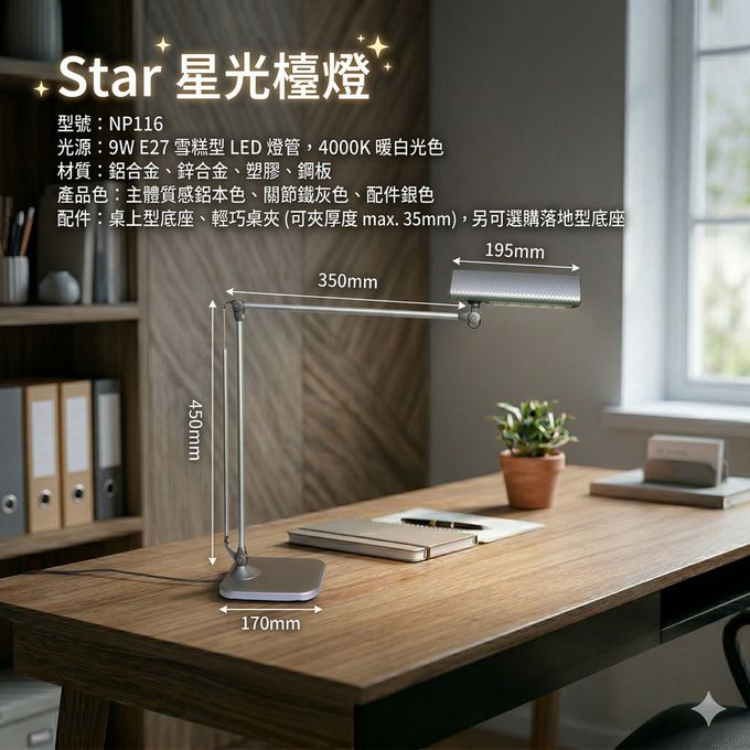 台灣製Star 星光LED雙臂檯燈-座夾兩用-NP1116