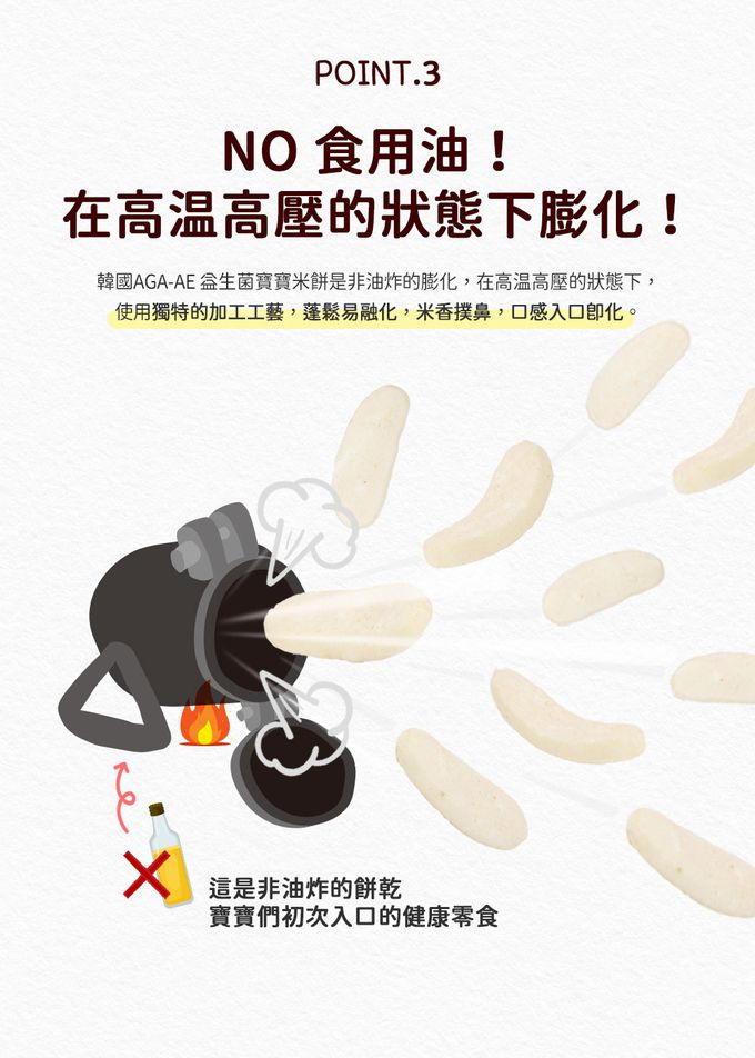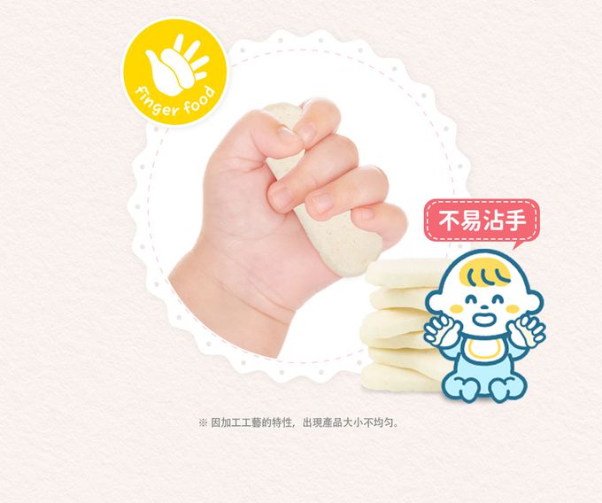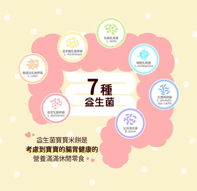 成分:米、果寡糖、南瓜粉、綜合維生素(磷酸鈣、維生素 C、綜合維生素 E 粉末(維生素 E、葡萄糖漿粉、辛烯基丁二酸鈉澱粉、二氧化矽)、氧化鋅、綜合維生素 A 粉末(葡萄糖漿粉、阿拉伯膠、玉米澱粉、維生素 A 醋酸鹽、維生素 E) 、綜合維生素 D 粉末(糖、阿拉伯膠、玉米澱粉、中鏈三酸甘油酯、二氧化矽、維生素 D3、維生素 E)、葉酸)、七種益生菌(胚芽乳酸桿菌 Lactobacillus plantarum、馬鈴薯澱粉、酪蛋白乳酸桿菌 Lactobacillus casei、鼠李糖乳酸桿菌 Lactobacillus rhamnosus、乳酸乳球菌 Lactobacillus lactis、乳雙崎桿菌Bifidobacterium animalis ssp. Lactis、嗜酸乳桿菌 Lactobacillus acidophilus、比菲德氏菌 Bifidobacterium breve、糊精) (含大豆及牛奶)。