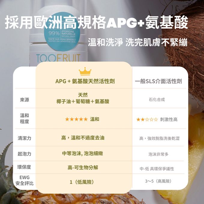 成分:椰子、橄欖、鳳梨 99,19% 為植物成分 19,84% 成分來自有機農場