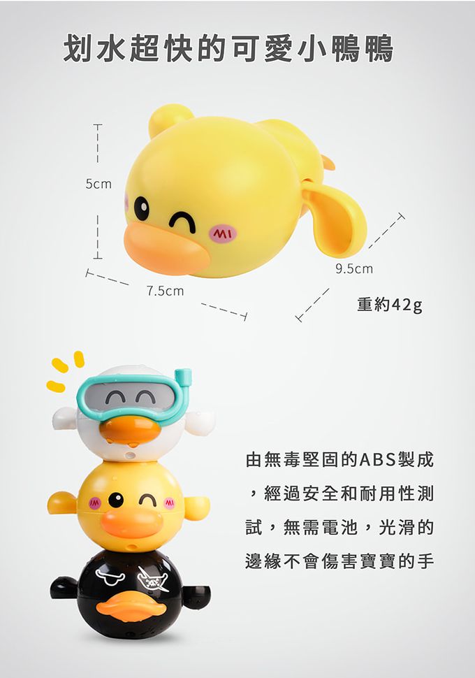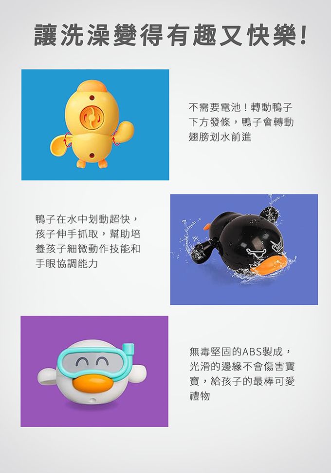不需要電池 !轉動鴨子下方發條,鴨子會轉動翅膀划水前進。鴨子在水中划動超快,孩子伸手抓取,幫助培養孩子細微動作技能和手眼協調能力。無毒堅固的ABS製成,光滑的邊緣不會傷害寶寶,給孩子最棒的禮物!