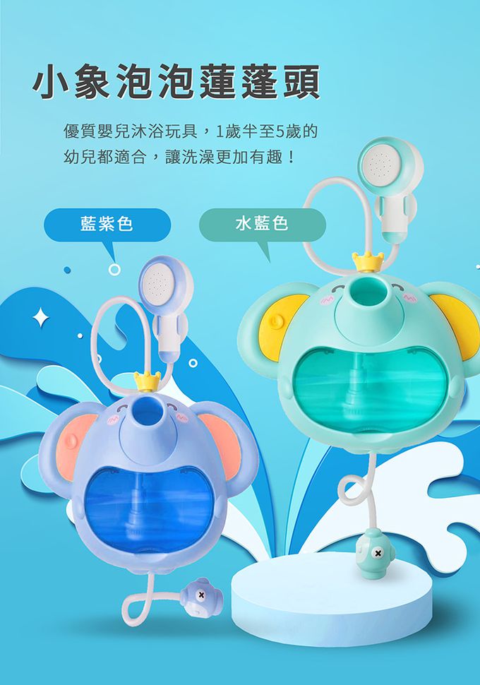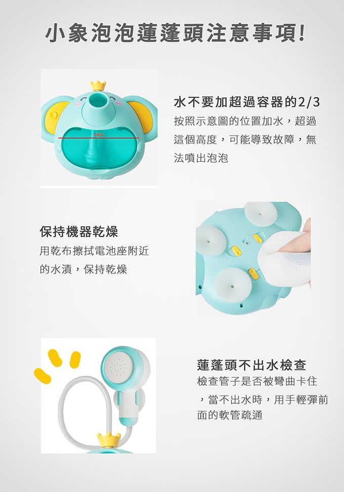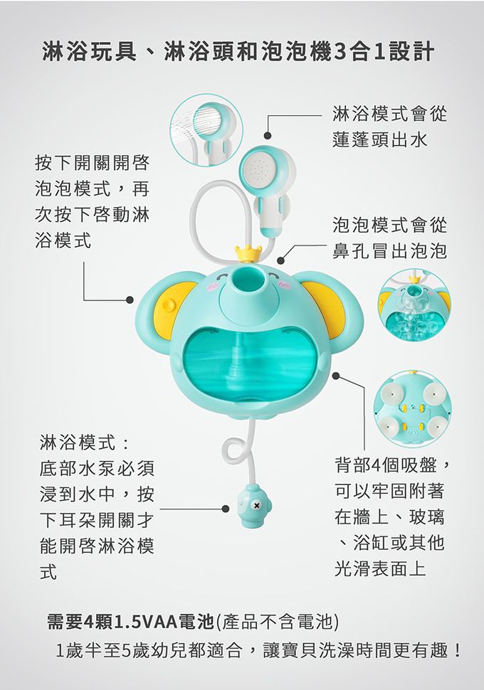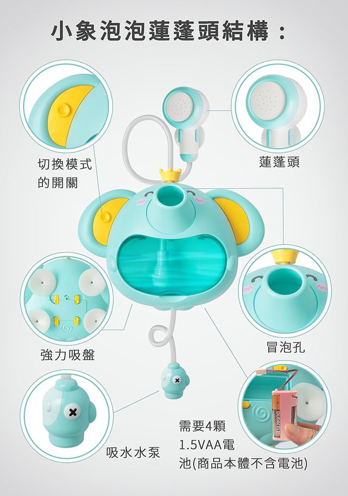 優質嬰兒沐浴玩具,1歲半至5歲的幼兒都適合,讓洗澡更加有趣!泡泡蓮蓬頭背部4個吸盤,可以牢固附著在牆上、玻璃、浴缸或其他光滑表面上。泡泡蓮蓬頭按下耳朵開關第一次,機器會發出音樂鼻子流出泡泡。泡泡蓮蓬頭底部水泵浸到水中,按下耳朵開關第二次上方蓮蓬頭出水。需要4顆1.5VAA電池(商品本體不含電池)