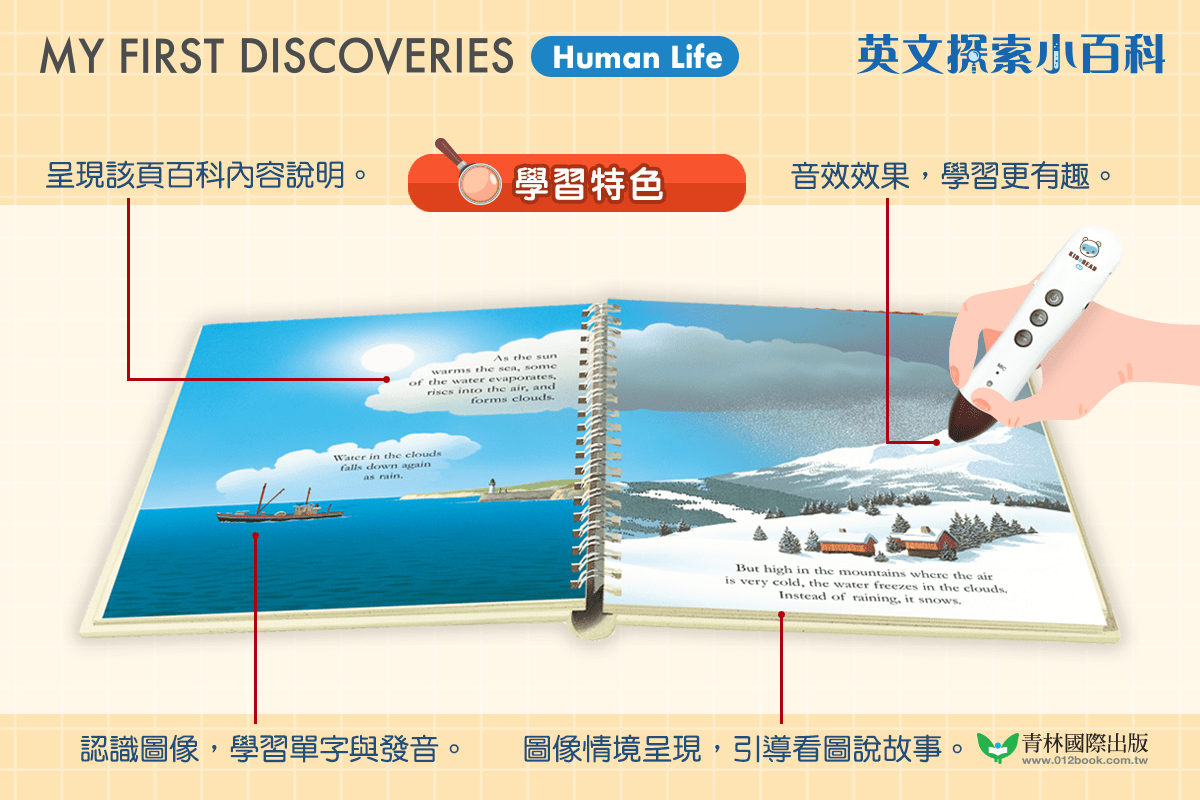 全球熱銷超過4000萬冊,被譯成30餘種語言的《英文探索小百科》MY FIRST DISCOVERIES結合「膠片閱讀 × 紙質手電筒 × 點讀圖畫書」,是一套超強英文科普點讀圖畫書,啟動孩子的視覺、聽覺與觸覺。書中透明膠片中,孩子運用紙質手電筒,搭配全球獨家的中文情境故事語音內容,與英文點讀,內容涵蓋廣泛,親子也可以一起共讀吸收,開拓廣大的世界觀。
