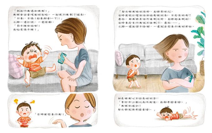 看著繪本裡小燦日以繼夜、無時無刻不離不開手機的樣子不覺莞爾,這是大人眼中手機中毒的孩子,但會不會也是孩子眼中的爸媽呢?像我現在就一面陪孩子吃晚餐,一面使用手機寫下感想。寫完,收起手機,我們都專心吃飯。