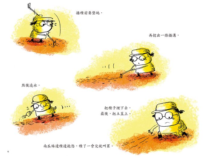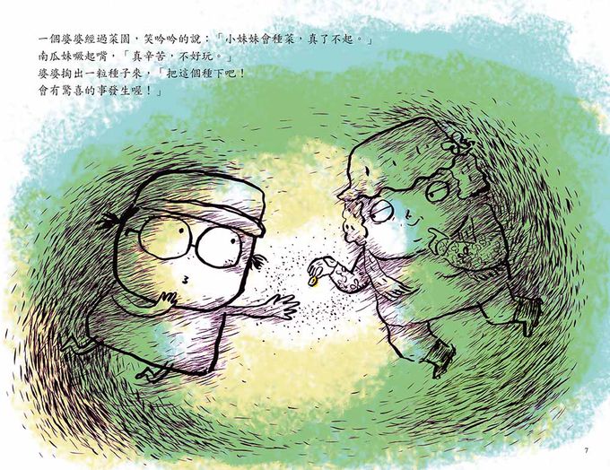 在這本書中,我透過一顆神祕的種子,帶出南瓜妹的心情轉變。她是個道地的都市小孩,喜歡薯條、漢堡,缺乏勞動,又不願親近土壤。當她的家人在菜園裡耕種時,她總是坐在遠遠的樹蔭下,一副事不關己的模樣,直到瓜婆婆給了她一顆神祕的種子,她的態度慢慢改變了。