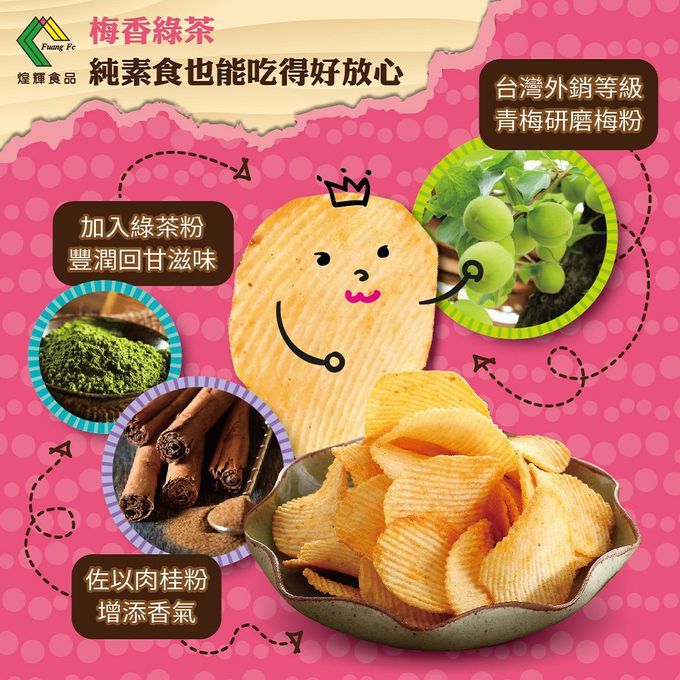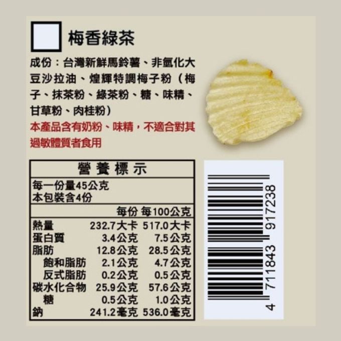 ○梅香綠茶(純素):台灣新鮮馬鈴薯、非氫化純大豆沙拉油、梅子粉(梅子、綠茶粉、肉桂粉、鹽、糖、日本味精、甘草粉)