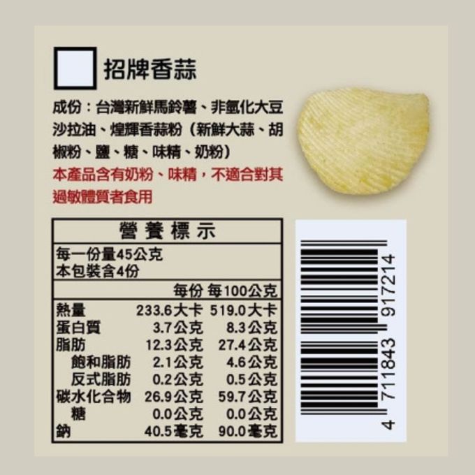 ○經典香蒜:台灣新鮮馬鈴薯、非氫化純大豆沙拉油、大蒜粉(新鮮大蒜、胡椒粉、鹽、糖、日本昆布味精、奶粉)