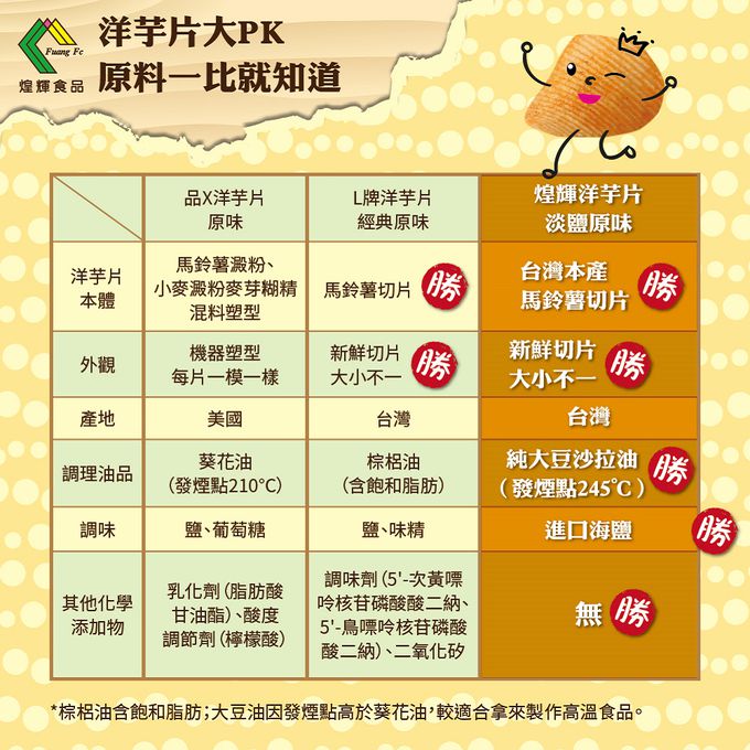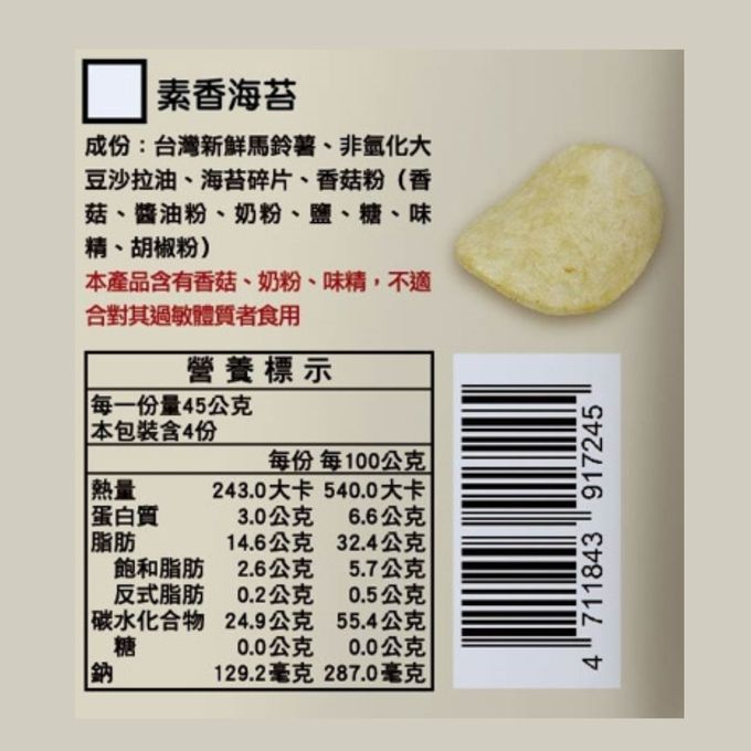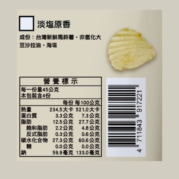 ○厚切原味(純素):台灣新鮮馬鈴薯、非氫化純大豆沙拉油、生機海鹽