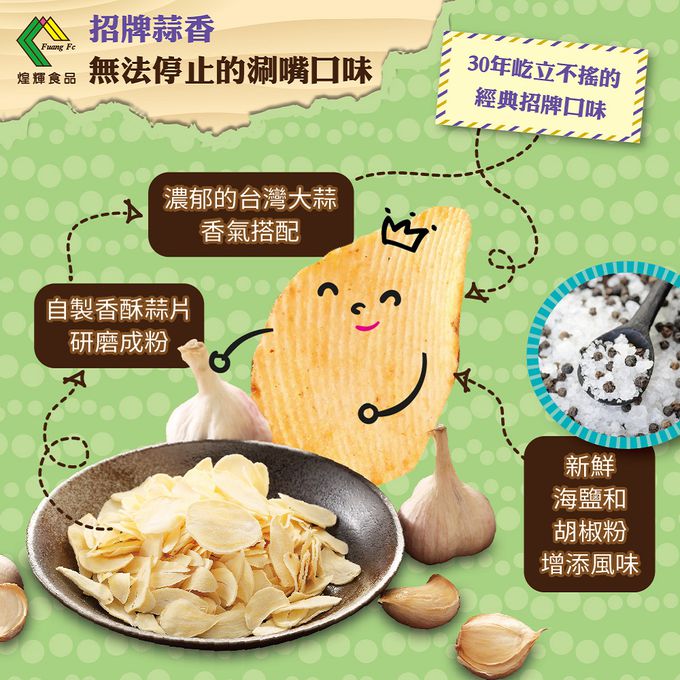 >>招牌蒜香:煌輝30年招牌炸蒜片搭配天然食材研磨成粉,灑在厚切波浪洋芋片上,是煌輝洋芋片屹立不搖的招牌口味!
