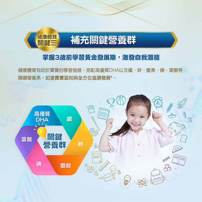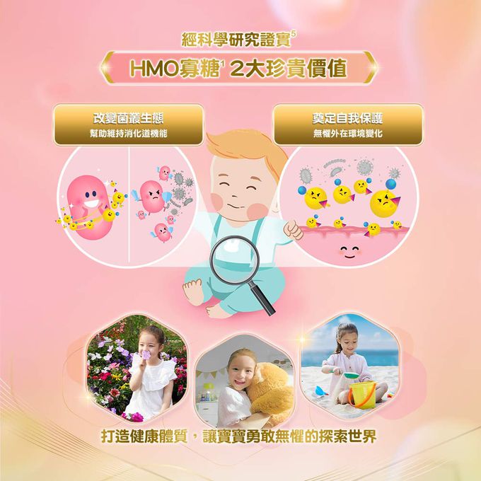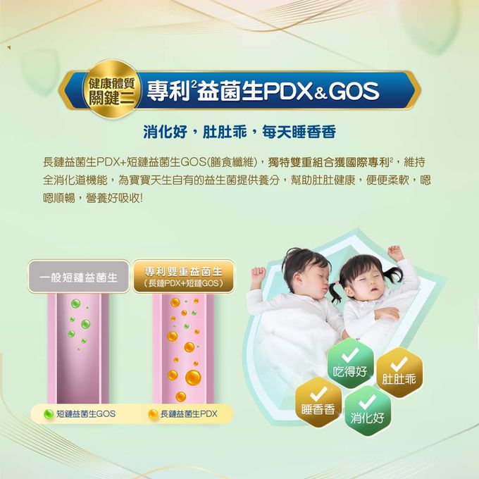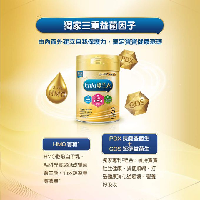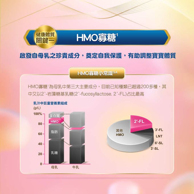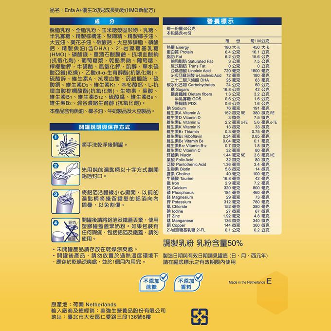 成分:脫脂乳粉、全脂乳粉玉米糖漿固形物、乳糖、半乳 寡糖、精製棕櫚油、聚糊精、精製椰子油、大豆油、葵花子油、碳酸鈣、大豆卵磷脂、磷酸鈣、精製魚油(含DHA)、2-岩藻糖基乳糖(HMO)、磷酸鎂、重酒石酸總鍍、抗壞血酸鈉(抗氧化劑)、葡萄糖漿、乾酪素鈉、葡萄糖、檸檬酸鉀、牛橫酸、氫氧化鉀、肌醇、單水硫酸亞鐵(乾燥)、乙酸dl-a-生育醇脂(抗氧化劑)、硫酸鋅、維生素A、抗壞血酸、鹼醯胺、硫酸鍋、維生素D3、維生素K1、本多酸鈣、L-抗壞血酸棕櫚酸酯(抗氧化劑)、生物素、葉酸、維生素B1、維生素B12、硫酸錳、維生素B6、維生素B2、混合濃縮生育醇(抗氧化劑)。