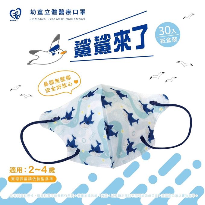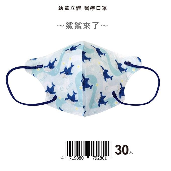 • 品名:天心 立體3D 2-4歲 幼幼醫療口罩30入/盒-鯊鯊來了