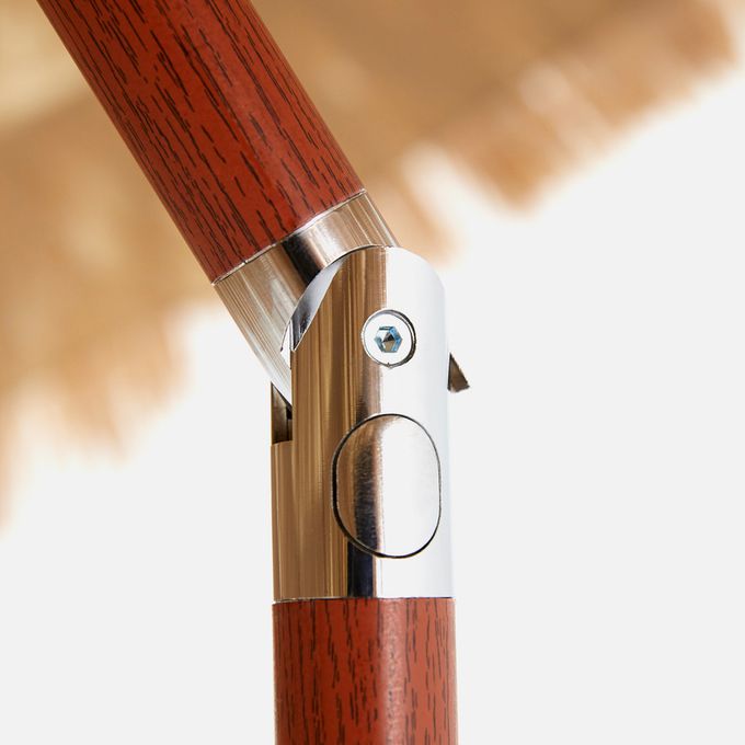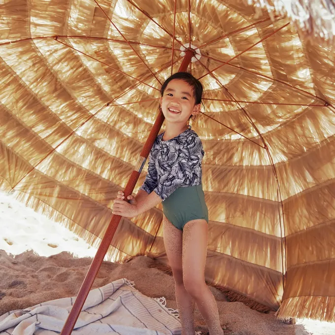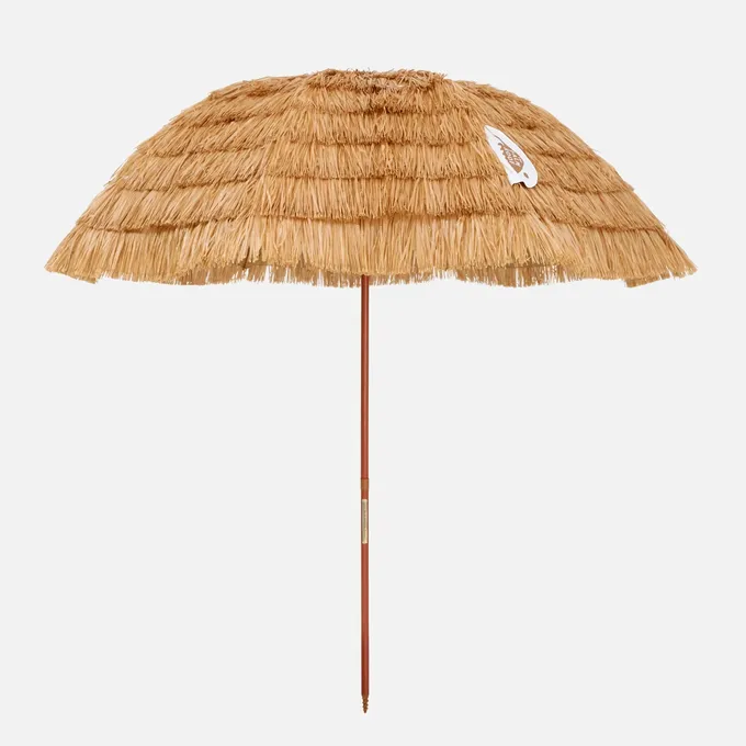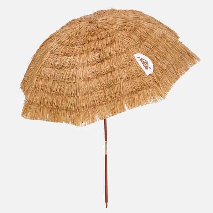 充滿度假氛圍的仿真茅草戶外遮陽傘,此尺寸適合家庭或團體使用於沙灘或草地,可依陽光方向傾斜不同角度,附收納袋可收起傘面、支桿和專用沙灘地插。