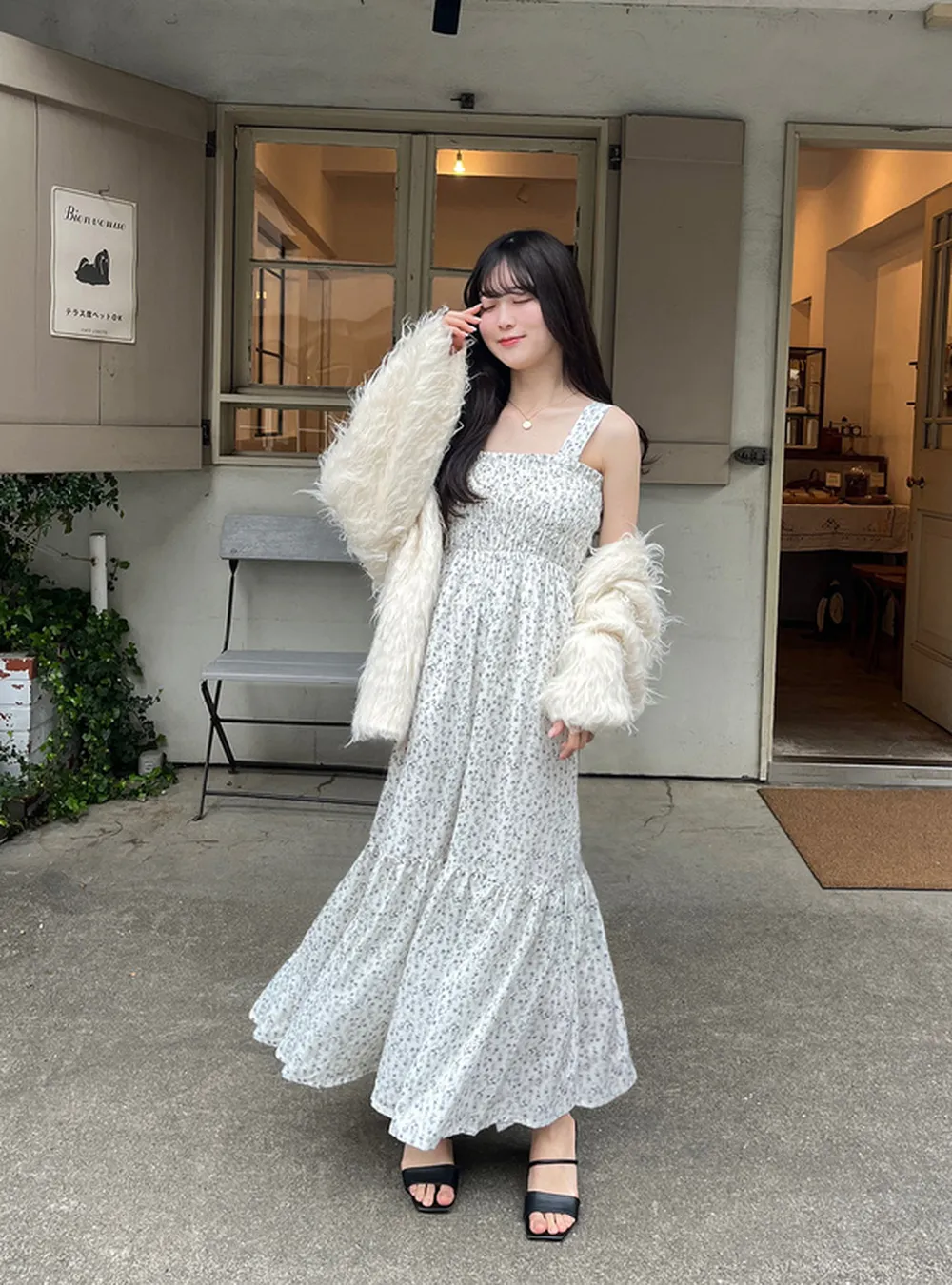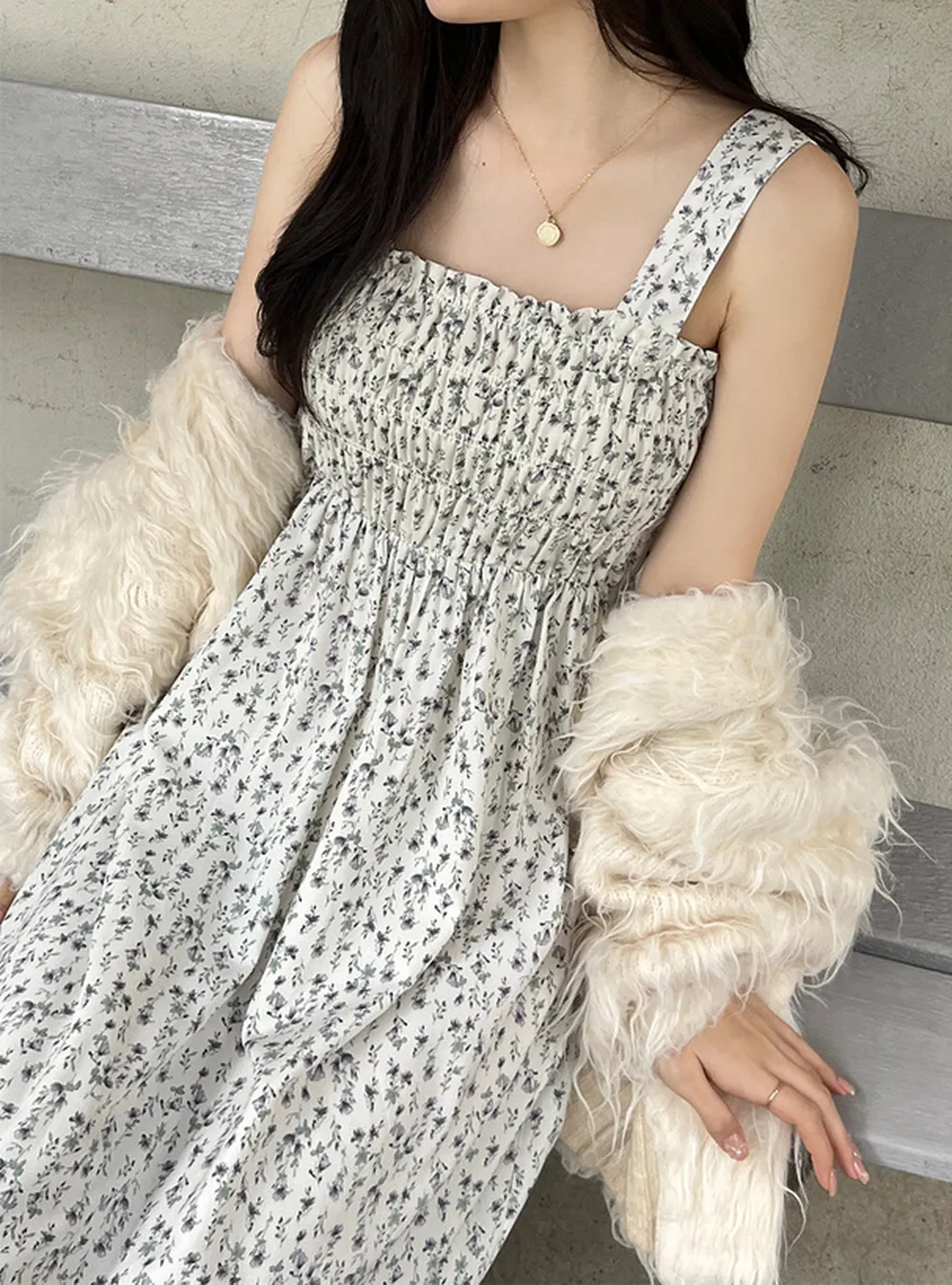 日本 GRL - 滿版浪漫小花縮腰背心長洋裝-象牙 (F)