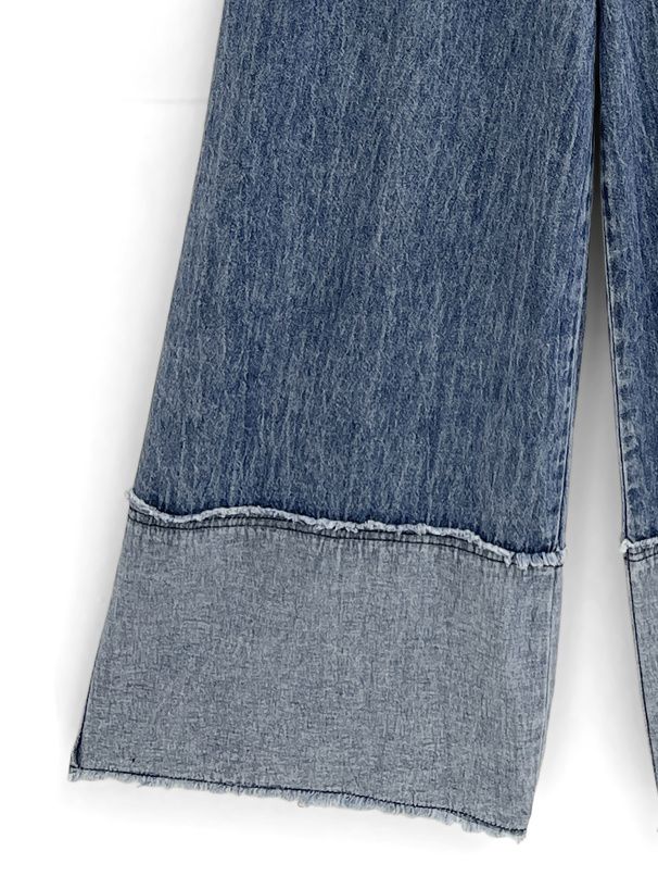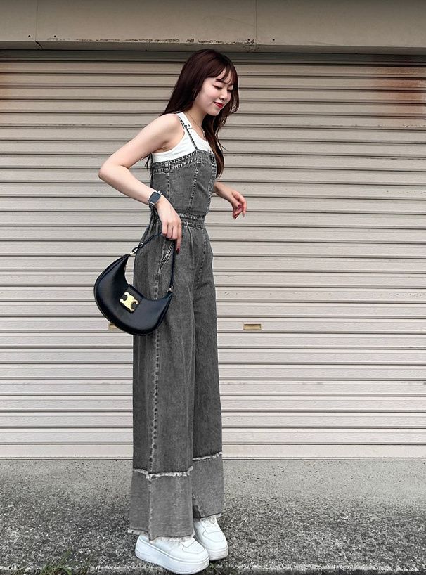 日本 GRL - 復古感長腿吊帶丹寧寬褲-下擺撞色-刷色黑
