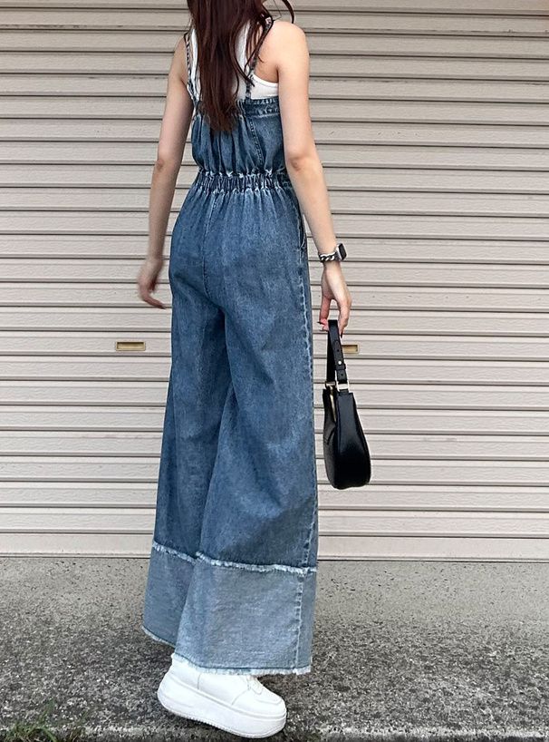 • 品名:復古感長腿吊帶丹寧寬褲
