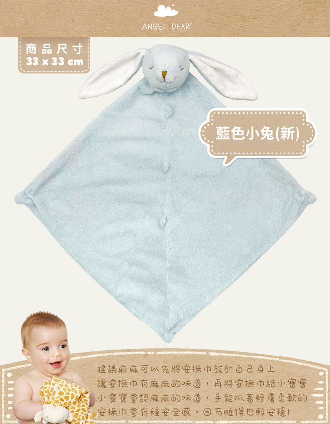 。安撫巾使用方式: 建議麻麻可以先將安撫巾放於自己身上, 讓安撫巾有麻麻的味道, 再將安撫巾給小寶寶, 小寶寶會認麻麻的味道, 手能抓著輕膚柔軟的安撫巾, 便會有種安全感, 因而睡得也較安穩。![]()
