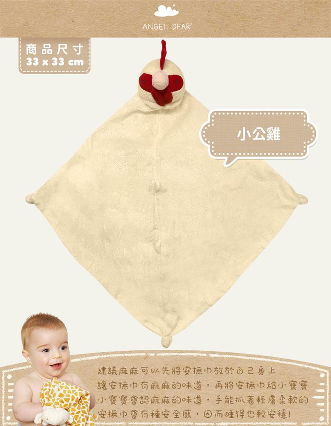 。安撫巾使用方式: 建議麻麻可以先將安撫巾放於自己身上, 讓安撫巾有麻麻的味道, 再將安撫巾給小寶寶, 小寶寶會認麻麻的味道, 手能抓著輕膚柔軟的安撫巾, 便會有種安全感, 因而睡得也較安穩。![]()