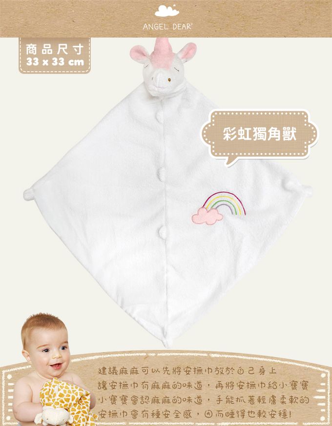 。安撫巾使用方式: 建議麻麻可以先將安撫巾放於自己身上, 讓安撫巾有麻麻的味道, 再將安撫巾給小寶寶, 小寶寶會認麻麻的味道, 手能抓著輕膚柔軟的安撫巾, 便會有種安全感, 因而睡得也較安穩。![]()