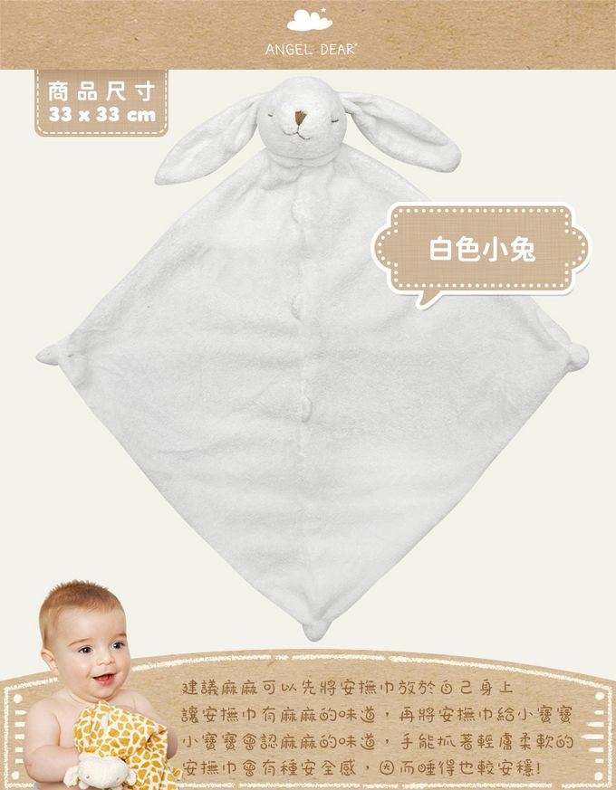 。安撫巾使用方式: 建議麻麻可以先將安撫巾放於自己身上, 讓安撫巾有麻麻的味道, 再將安撫巾給小寶寶, 小寶寶會認麻麻的味道, 手能抓著輕膚柔軟的安撫巾, 便會有種安全感, 因而睡得也較安穩。![]()